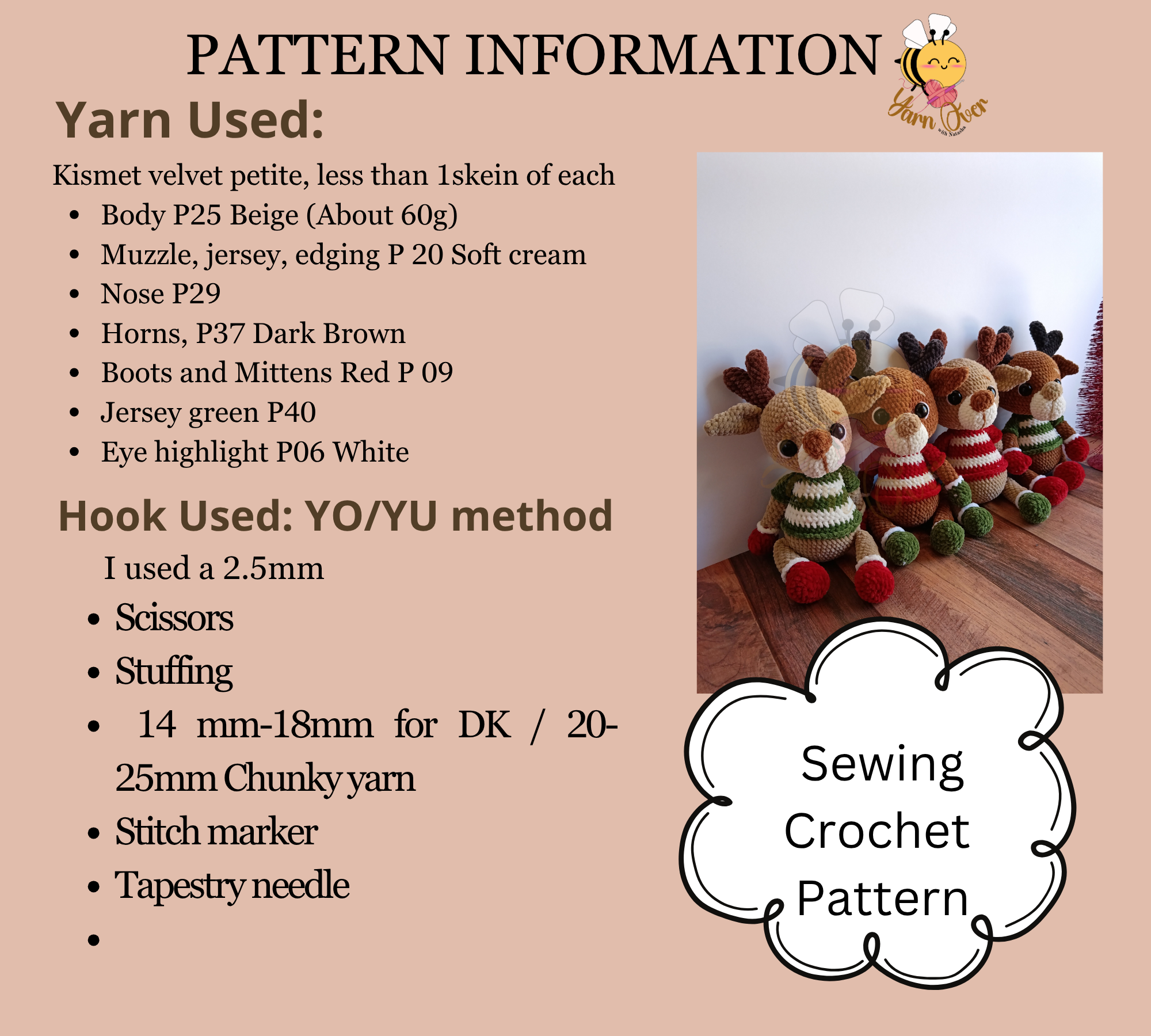 This pattern is in English and written in US terms; this pattern is a semi-low sewing pattern. The head of the reindeer has some sewing pieces, where the body is made in one section with the legs. Videos for embroidery eyes and how to shape the face for the Reindeer are linked in this pattern.