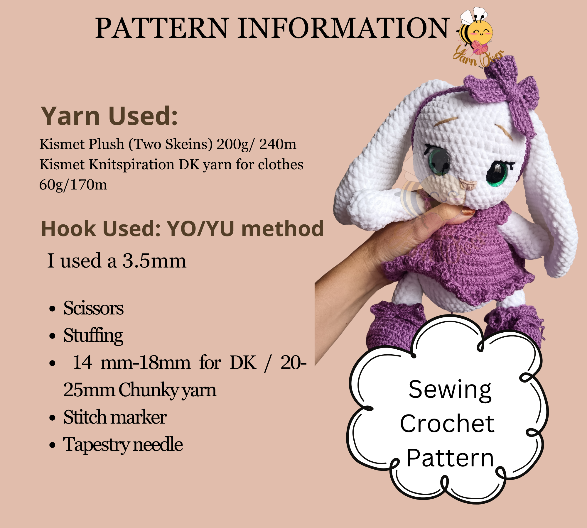 This pattern is in English and written in US terms; this pattern is a semi-low sewing pattern. The Bunny has some sewing pieces, where the dress and booties are made in one piece. Videos for embroidery eyes and how to shape the face for the bunny are linked in this pattern.